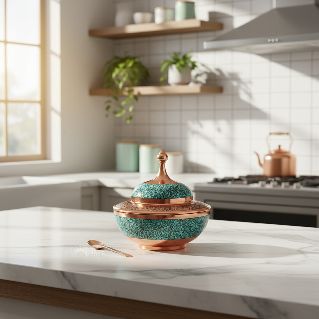 The Turquoise Saljughi Sugar Bowl L features a refined design with a vibrant turquoise glaze, adding a touch of elegance to your tabletop. Its generous size provides ample capacity for sugar storage, while the secure lid helps maintain freshness. Crafted with durable materials, this bowl combines aesthetic appeal with practical use for both everyday and formal settings.